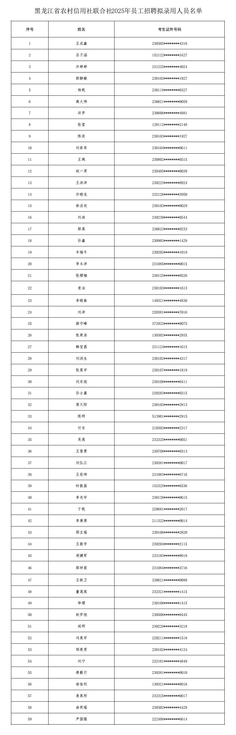 黑龙江省农村信用社联合社2025年员工招聘拟录用人员公示